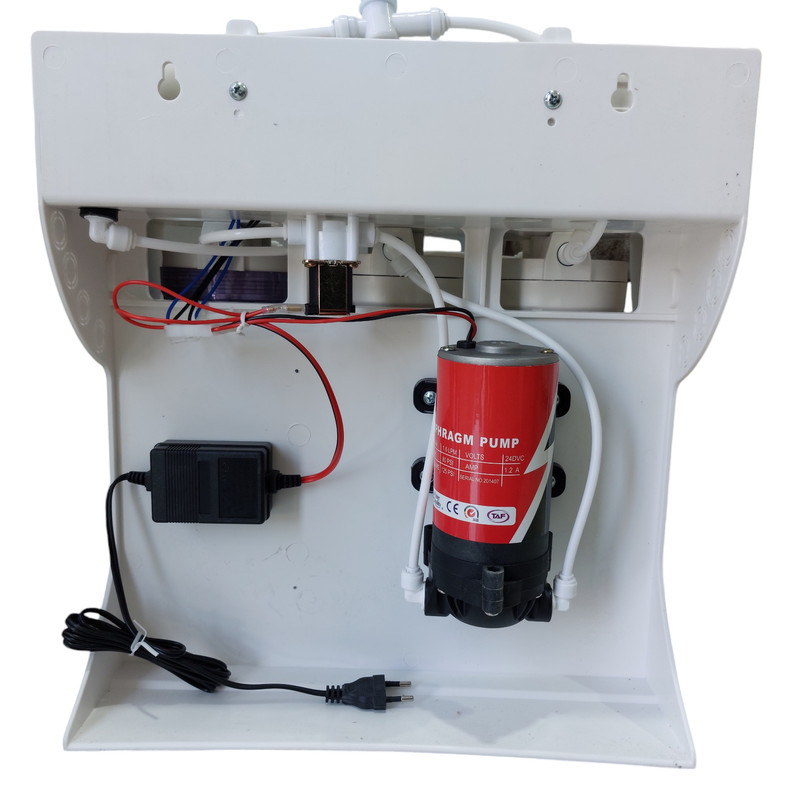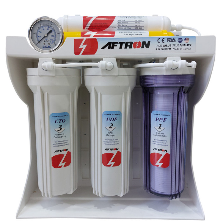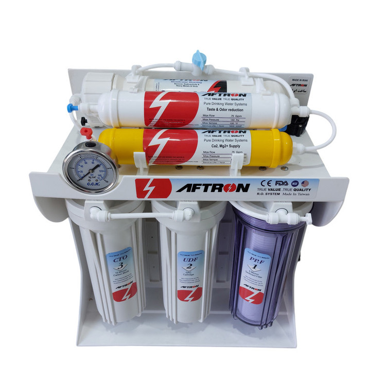 دستگاه تصفیه آب خانگی افترون Aftron یک دستگاه تصفیه آب خانگی شش مرحله ای زیر سینکی می باشد که محصول کشور ایران با تکنولوژی تایوان بوده و با روش اسمز معکوس می تواند تمام املاح مضر و مواد آلی را حذف کند و با فیلتر مینرال مواد معدنی مورد نیاز بدن را به آب بر گرداند.فیلتر ممبران از نوع فیلمتک با برند آمریکایی است.دارای گیج فشار و براکت که تمام فیلترها ،پمپ و گیج فشار بر روی این براکت ( شاسی ) نصب می شوند.